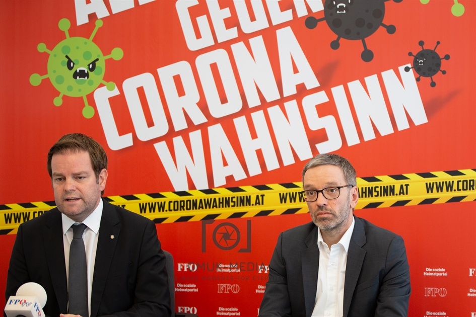 INNSBRUCK, ÖSTERREICH - JUNE 4: Mitglied des Tiroler Landtags Markus Abwerzger und Klub Vorsitzender Herbert Kickl (FPOe) bei der Pressekonferenz der FPÖ Tirol mit Herbert Kickl gegen den Coronawahnsinn in FPÖ Geschäftsstelle Innsbruck am June 4, 2020 in Innsbruck, Österreich.