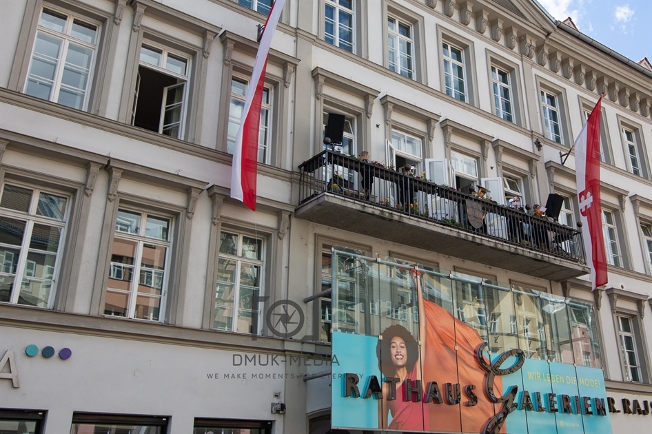 INNSBRUCK, AUSTRIA - MAY 3: R.E.T. Chamber Brass at the Innsbruck Town hall balcony during the Minutes of commemoration of the end of the Second World War in Innsbruck at Rathaus Innsbruck on May 3, 2020 in Innsbruck, Austria.