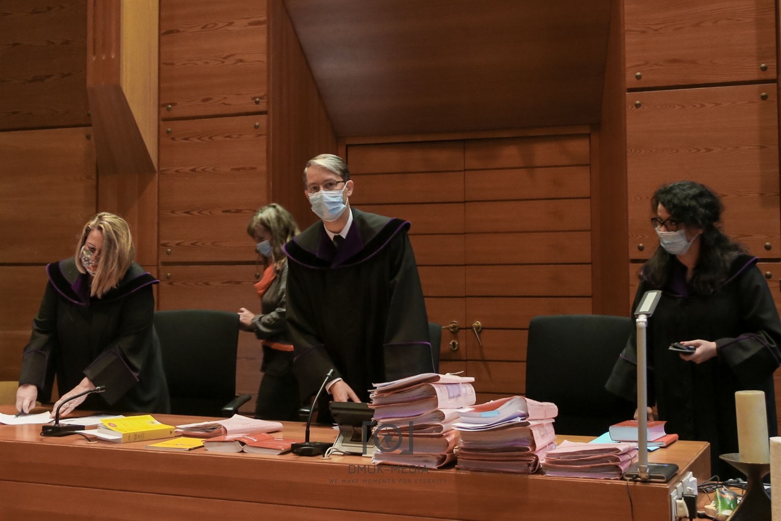 INNSBRUCK, AUSTRIA - OCTOBER 15: The presiding judge of the jury, Hermann Hofer, enters the trial room with the two assessors during the Trial for crimes according to 3g VerbotsG 1947 - National Socialist re-engagement at Landesgericht Innsbruck on October 15, 2020 in Innsbruck, Austria.
