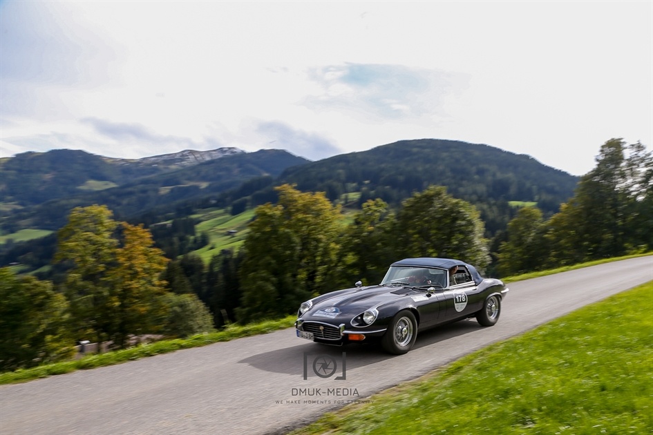 INNSBRUCK, AUSTRIA - OCTOBER 2: Driver Helmut Schlotterer, Jaguar E-Type V12, Construction year 1973, ccm 6000, Horsepower 400 during the Alpine Rally Kitzbuehel - Karwendel Round at Bruckerberg - Alpbachtal on October 2, 2020 in Innsbruck, Austria.